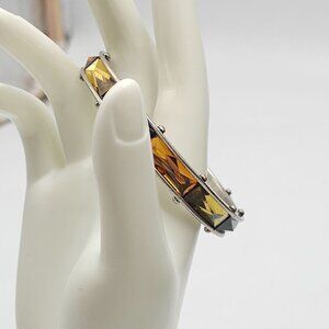 This exquisite bangle bracelet by Jessica Simpson captures the vintage allure with its silver-tone finish and captivating gemstone accents. The blend of warm amber and deep onyx hues evokes a timeless elegance, making it a distinguished accessory. A perfect blend of classic design and contemporary style, it complements any ensemble.