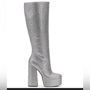 Step into sparkle with these Jessica Simpson Sinalla platform boots! Completely covered in gorgeous silver rhinestones, they feature a round toe, cushioned interior, inside zip closure, and flexible elastic gore.