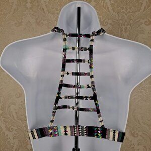 This bikini top has adjustable straps around the neck area with a strappy racerback. It is a pull on design - no closures. Lined but not padded. Fun geometric pattern/stripes.