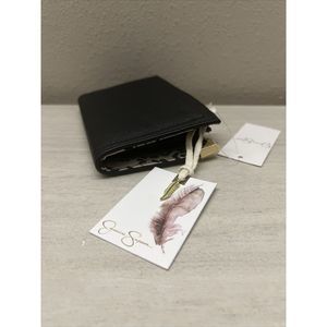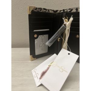 Jessica Simpson Small Fran Center Divider Faux Leather Wallet Color Black NWT. Faux leather wallet in the color Black/Meteorite with gold tone stud accents on front top corners, gold toned logo on front. Gold tone hardware. Inside Wallet clear ID window, bill slot, multiple card slots, slip pockets & zip pocket in center of wallet. Leopard print inside wallet.