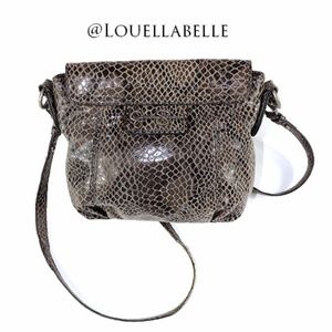 Jessica Simpson Snakeskin Buckle Bow Crossbody Bag. Closer to a grey brown than a warm brown. The purse itself is in brand new condition. Unbelievably clean lining and bottom. The strap though has wear on the piping. I always try to make all flaws and blemishes (if any) visible in my photos. Many of my items are used. Not all of my items are in brand new condition.I try to price items accordingly. I do welcome offers. The worst I can do is decline. Let me know if you have any questions! :-)