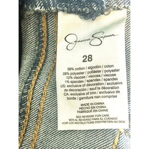 Jessica Simpson Soft Sculpt pull-on flare jeans, distressed wash, size 28. Cotton, polyester, viscose & spandex blend. Pull-on, elastic waist.