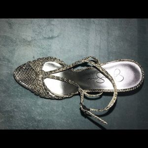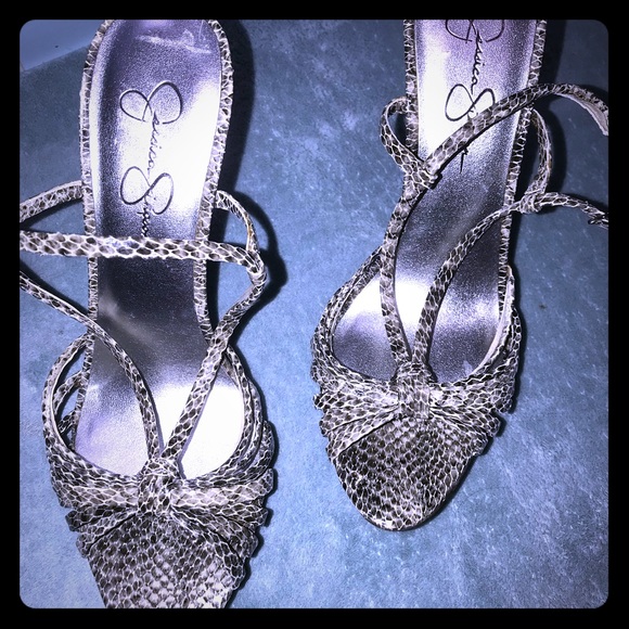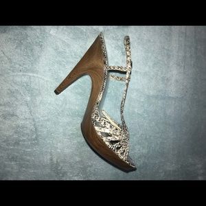 Wow!!! Stunning shimmery python embossed leather with gorgeous woodgrain and rubber comfort sole. Worn just once on carpet so sole is like new! I did find a minor scuff on one toe and the straps are a bit delicate since they’ve just been in dry storage for a bit, so personally I would reinforce with a touch of gorilla glue to ensure the straps keep their fold if you plan to be on your feet a while. Super comfortable and 💯 showstoppers! Fits 8 1/2 - 9.