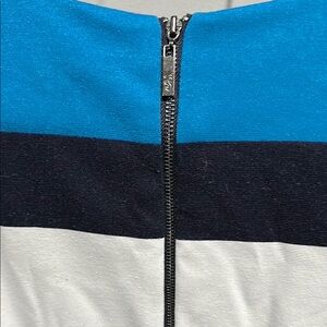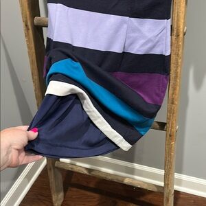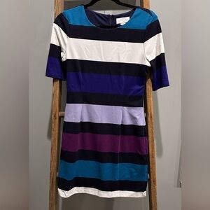 Stylish dress with 3/4 length sleeves, tapered waist with subtle seem for tailored look. Colors are rich colors of stripes in purple, blue, and black. Great dress for work or night out. Materials tag is missing, feels like Ponte knit. Dress has liner through the bodice, not sleeves. Accessories not included.