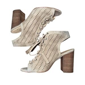 Jessica Simpson Suede Taupe Lace Up Tassel Block Heels