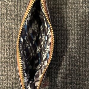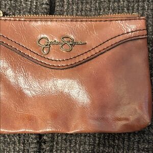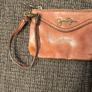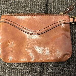 Elegant tan leather wristlet with signature logo. Features a wrist strap for easy carrying.