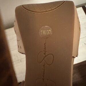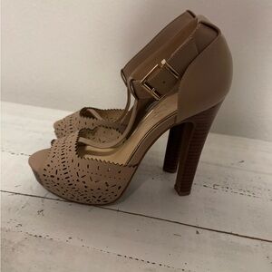Chic tan heels with peep-toe design. Stylish cut-out details. Perfect for any occasion.
