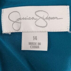 This elegant strapless dress by Jessica Simpson is designed for cocktail occasions, featuring a flattering A-line silhouette. The dress showcases a striking color-blocking effect with two shades of blue, creating a modern and stylish look. Its sleeveless design and fitted bodice offer a chic and sophisticated fit, perfect for a night out.