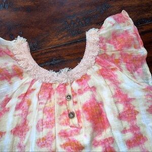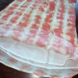 Adorable Jessica Simpson Coral, orange, beige and white Tie Dye Dress. Fully lined with Fringe neckline, short flutter sleeves and back button closure. Size 3T in excellent barely worn condition. 2T on tag, but way too big for a 2 year old.