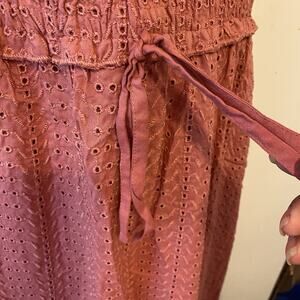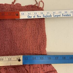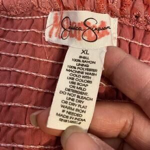 The Jessica Simpson Tiered Coral Floral Eyelet Smocked Lined Maxi Dress in XL size is a perfect beach and vacation outfit. This dress features a square neckline, sleeveless design with strappy sleeves, and is made from a comfortable rayon material with a lace fabric type. It has a pullover closure and is machine washable for easy care. The dress is accented with ruffles, layers, and straps, and has a bohemian flower and beach theme, making it a stylish option for casual occasions and parties.