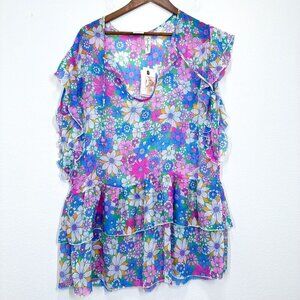 Jessica Simpson Tiered Ruffle Retro Vibrant Floral Swim Coverup Mini Dress Sheer
