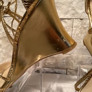 These are the Jessica Simpson Valren Wedge Sandals in a gold metallic croc print. The shoes feature a wedge heel and an ankle wrap lace-up closure with a round open toe.