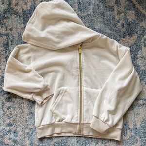 So soft and adorable. The gold zipper makes this sweatsuit elevated casual! Not bright white, more of an off-white.