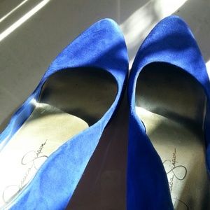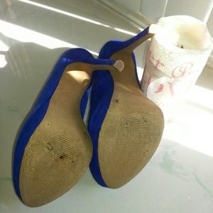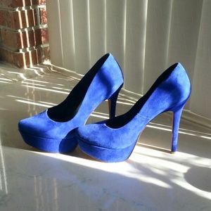 Blue suede pumps with 5 1/4 inch heel and 1 1/4 inch platform. Worn once to a wedding. The size says 9 but I'm an 8 1/2 and I can fit in them.