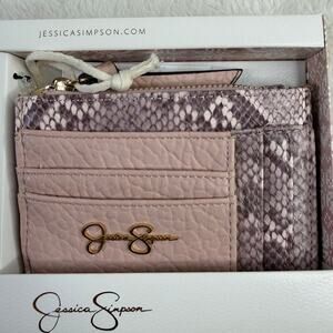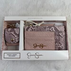 This is a brand-new Jessica Simpson gift set including a wallet and matching AirPod case in pink snake print. The wallet is multi-compartment, and the AirPod case is designed to fit most AirPods models.