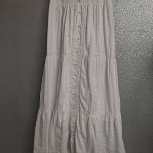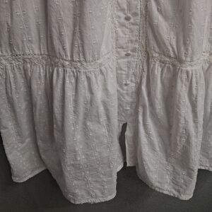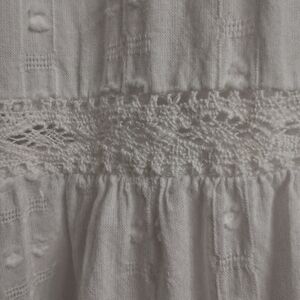 this is a beautiful dress with so much character. There is a low v neckline with decorative buttons all the way to the hemline. There are two tiers with lace & also down the front on both sides of the buttons. The whole dress is covered with little raised dots.