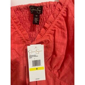In the heart of a bustling marketplace, this vibrant red top catches the eye of a fashion enthusiast. The Jessica Simpson brand offers a delightful blend of style and comfort with its smocked detailing and puff sleeves. Made from a cotton-polyester blend, it promises a graceful fit, perfect for summer outings.