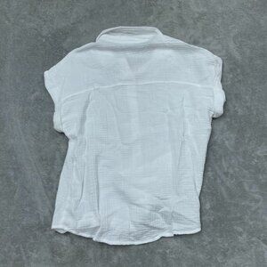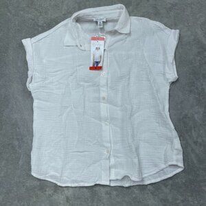 Lightweight 100% cotton button-front shirt with short sleeves. Features a semi-sheer textured design, collared neckline, and rounded hemline. Made in Cambodia. New with tags.