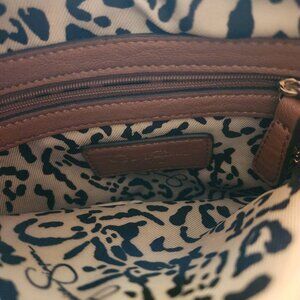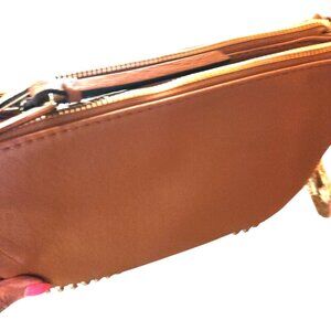 Jessica Simpson Camille crossbody bag in cognac, pebbled vegan leather and features gold studs, fully-lined interior, interior pockets, and a cellphone pocket. There are three separate compartments, the middle one has a snap closure and the outside compartments have a zip closure with beautiful gold logo hardware