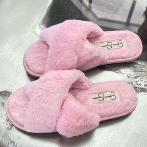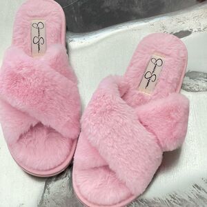 Cozy pink fuzzy slippers with a criss-cross design. Perfect for lounging.