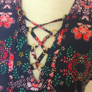 V-neck with lace-up tie. Flutter sleeves. Concealed side hook-and-eye zip closure. Allover floral print - Trim detail along hemline. Lined.
