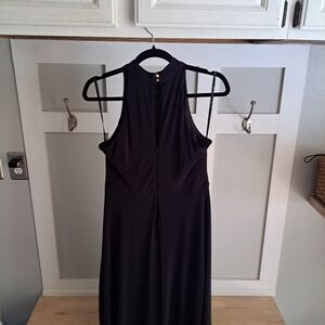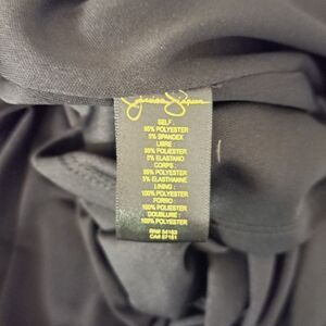 Elegant black dress by Jessica Simpson featuring a halter neckline and flattering hanky hem. Soft, stretchy material for a comfortable and stylish fit.