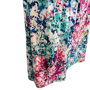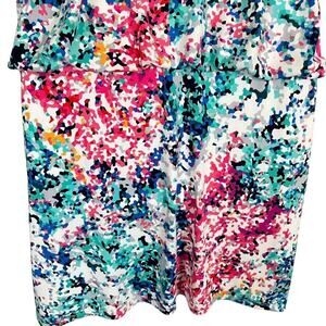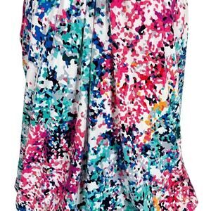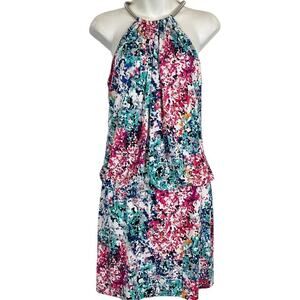 This Jessica Simpson dress is a pink, geometric patterned, sleeveless, halter-necked, mini dress with a clasp closure. It is made of polyester and spandex jersey fabric, and has a blouson style. The dress is stretchy and has a size of 6. It is recommended to be hand washed only. It is perfect for summer, fall, and spring, and is made in Vietnam.