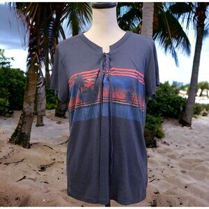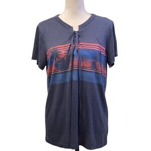 Simpson Women's Knit Top Size L Drawstring Tie Blue Tropical Print
