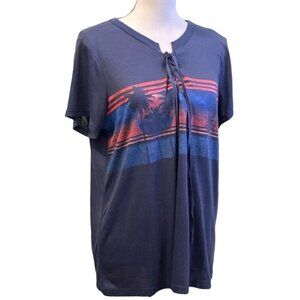 Jessica Simpson Womens Knit Top Size L Drawstring Tie Blue Tropical Print