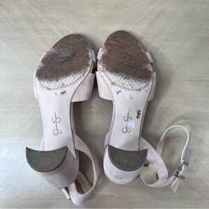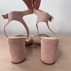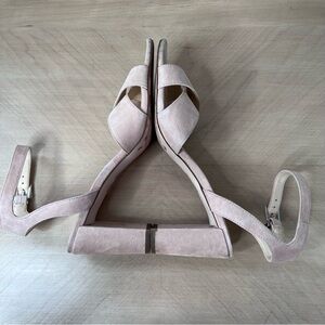Light pink suede heeled sandals with ankle strap and crossed straps over toes. Chunky 3.5” heel.