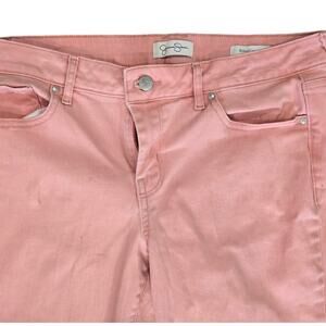 Trendy Jessica Simpson cropped skinny jeans in a bold orange hue. Features rolled hem detail, flattering stretch cotton blend, and classic 5-pocket style. Gently used, great condition. Approx. flat lay: 33" waist x 9" rise x 24" inseam. Perfect for casual chic looks year-round.
