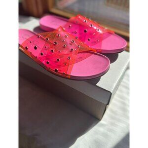 Bright and bold slide sandals designed for casual comfort. Rhinestone-studded PVC straps add a touch of sparkle to the vibrant pink design.