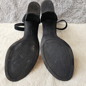 • Black ankle strap and heel with a leopard print and transparent toe covering.