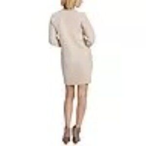 This above-knee length dress features a flattering V-neckline and slight blouson long sleeves for a chic look.