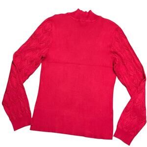 Stylish red cable knit sweater with intricate sleeve design. Perfect for a cozy and chic look.