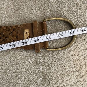 tylish Jessica Simpson woven belt in a warm brown tone. Features a braided leather front with fabric stretch band and antique gold buckle. Perfect for jeans, dresses, or layering over sweaters for a chic boho touch.
