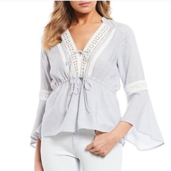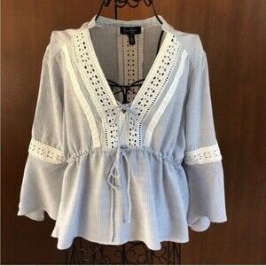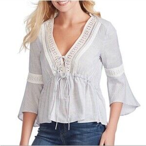 Beachy Jessica Simpson top in gardenia stonewashed stripe. In great used condition. Ties in the front. Has lace detailing on the front, back, and sleeves. Size Medium.