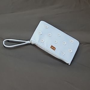 Jessica Simpson Wristlet Clutch Blue Vegan Leather W/Flowers & Bead Zipper Close