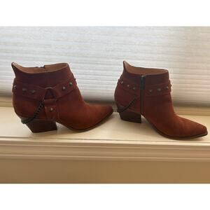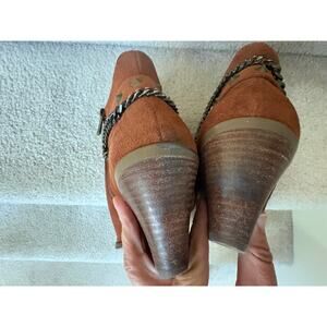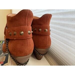 These Suede Chelsea-height boots are fyre. From the seller's personal collection, these real suede exterior in that delicious orangy-brown cognac color, synthetic interior booties feature a chain, studs, zipper, and the perfect sized heel and scuffed soles to take the fine lady wearing them line dancing. This seller pride herself on cleaning and restoring shoes/boots (and purses!), and these are treated with weather proofing spray, buffed with a mink oiled sponge, the interior lining has been sanitized, and the soles have been scrubbed with a microfiber cloth and soap. They are ready for you to wear. Bring on ladies' night!