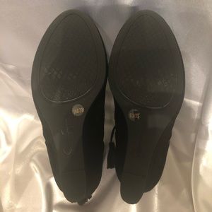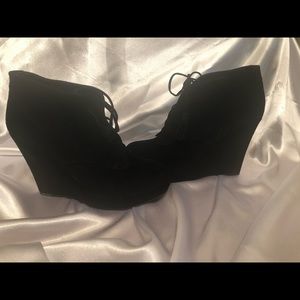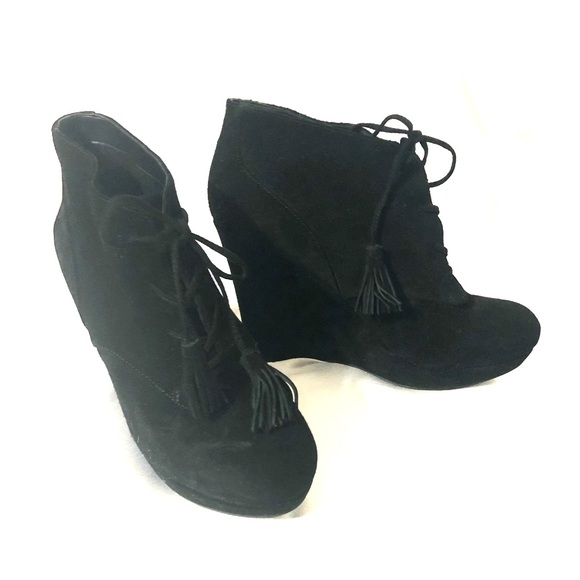 Black suede wedge heel bootie with tassel tie