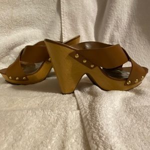 Well loved super comfy pair of Jessica Simpson wooden heeled clogs. There is still lots of party life in these shoes. Sturdy well balanced pair of sandals