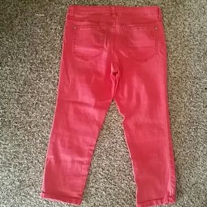 Red capris. Fit tighter than a 30. Worn 3 times. 98% cotton and 2% spandex.