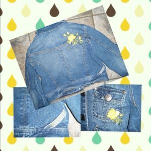 Adorable cropped denim jacket- LOVE the lines in the back seams. I think it's a juniors M, but it has enough stretch to be flexible. EUC. Size M.