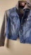 Jessica Simpson denim jacket with gray knit sleeves & detachable knit hoodie GUC