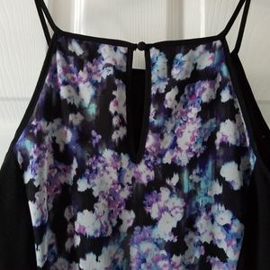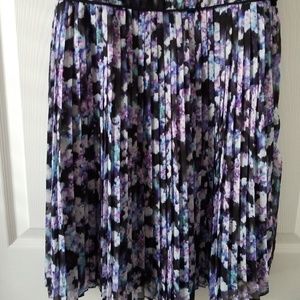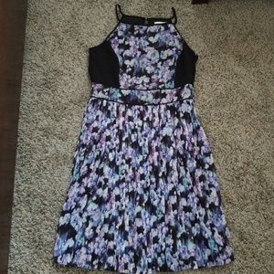 Purple and blue floral dress with high neckline. Pleated throughout bottom, cute detail on the back. Hits about knee length. Worn to 2 weddings