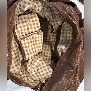this shiny foe leather duffel bag is great for weekend trips or the gym. It is pre-loved but still and quite good condition. Please see all pictures for details.