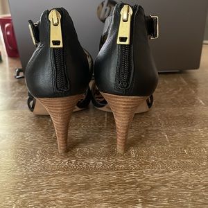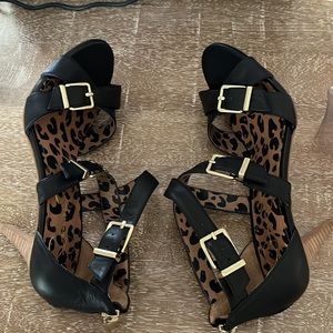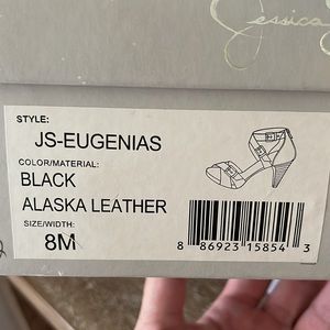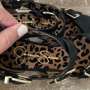 Brand new never worn ( except for trying on) Jessica Simpson Eugenia black leather gold buckle open toe heels in perfect condition. Zip closure up the back. Size 8. Heel height 3”