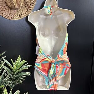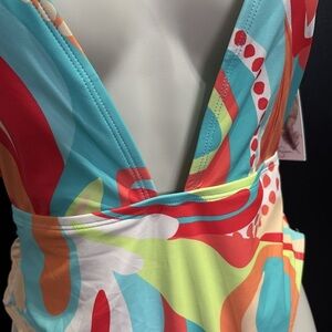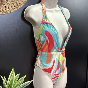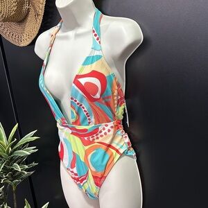 Jessica Simpson low V neck,sexy tie back,removable pads,colorful print 1 pc swim