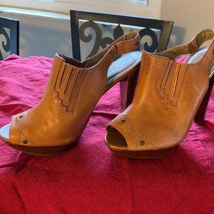 Cutest open-toe platform sandal boot! They look great with jeans, skirts, shorts...basically everything. Leather Upper. Excellent condition except for slight wear and tear on outside of right heel and inside of left heel (see picture).