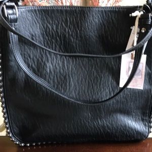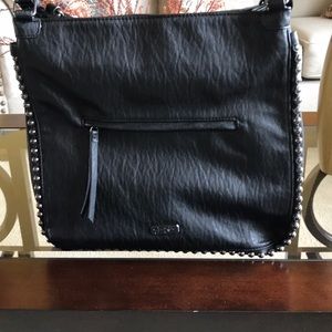 Beautiful black Camille pocket book with straps and beads going down the sides, two zippers in the inside and one on the outside